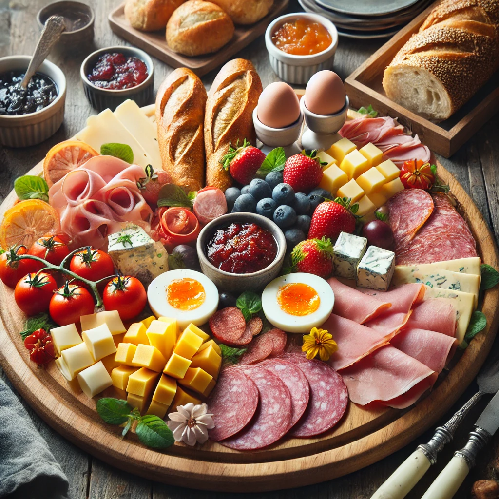A breakfast platter for two, including Black Forest ham, salami, grilled ham, Brie, Gouda, two boiled free-range eggs, tomato-mozzarella, fruit salad, butter, homemade jam, and the dip of the day, served with bread and rolls.