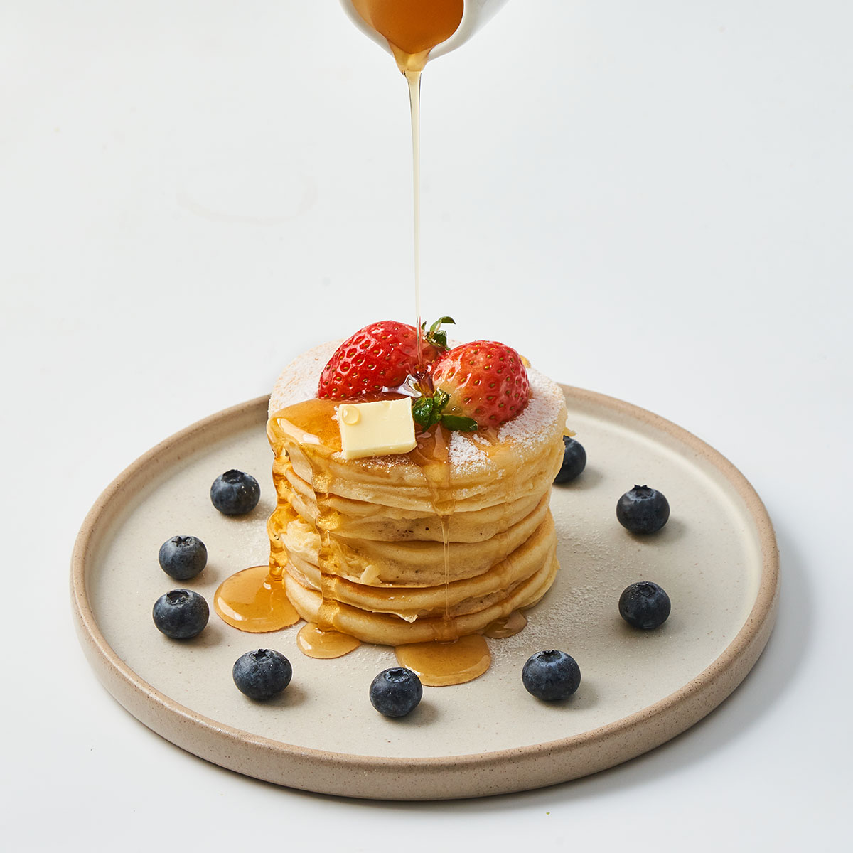 Enjoy a delightful stack of four incredibly fluffy pancakes, generously drizzled with rich maple syrup and accompanied by a vibrant selection of fresh, seasonal fruit that adds a burst of natural sweetness to each bite.