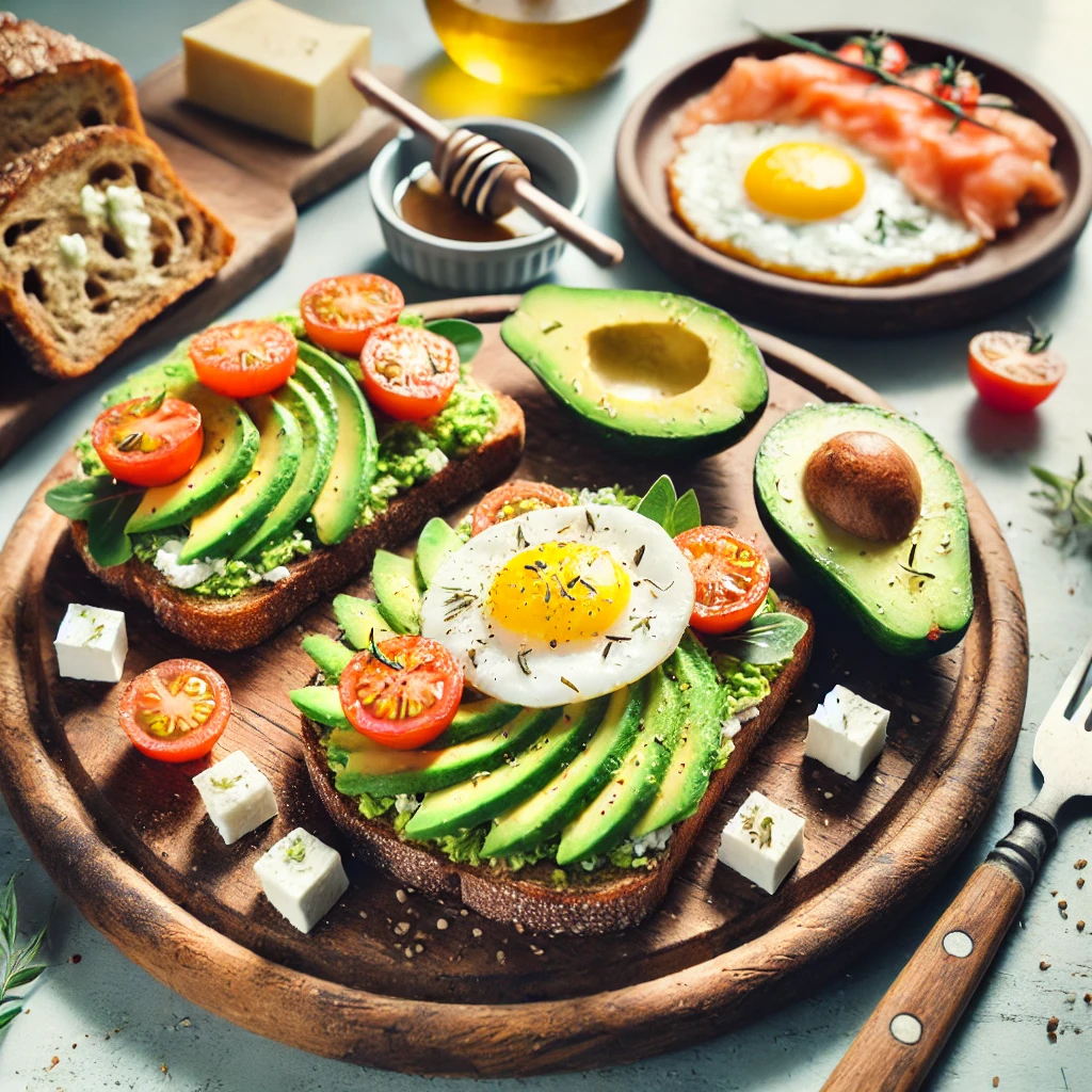 Farmers’ bread with fresh avocado and tomatoes, with optional toppings: feta and spring onions for €2.50, smoked salmon with honey-mustard sauce for €4.20, or a fried egg for €2.00.
